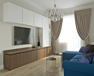 Проект создан для небольшой семьи из двух человек. Заказчица - энергичная женщина, как и многие жители мегаполиса, устающая от напряженного ритма города. Поэтому главная идея этой гостиной - легкое, воздушное, уютное пространство со скрытыми местами хранения, чтобы ничто не раздражало взгляд. Квартира расположена в доме 1950 года постройки, что и определило стилистику интерьера. Хорошо сохранившиеся карнизы и потолочные розетки было решено оставить и поддержать классическими элементами на стенах и в фасадах мебели.