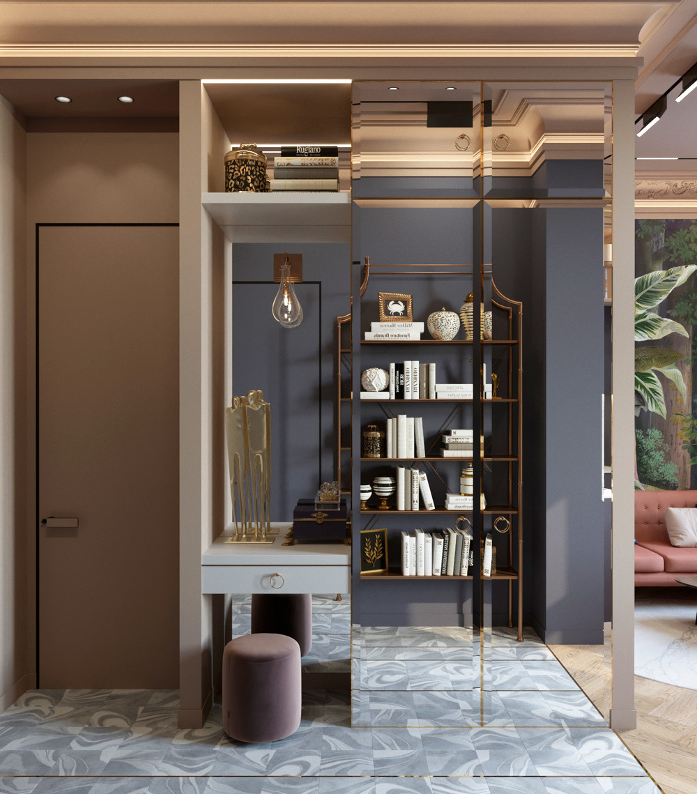 Одной из отличительной черт нашей квартиры является то, что мы смогли, при достаточно небольшом метраже, отделить спальню от зоны для гостей, сделав её отдельным помещением. При входе нас встречает красивый холл и отдельная гардеробная за дверью.