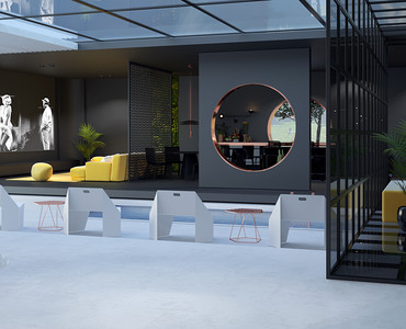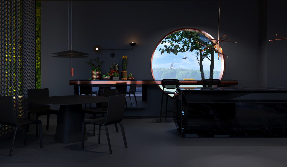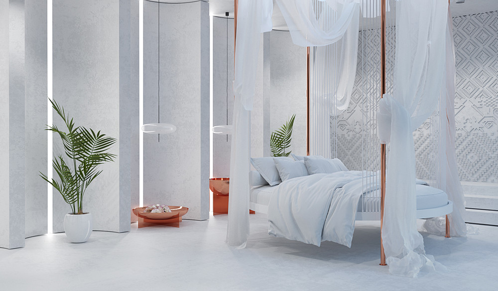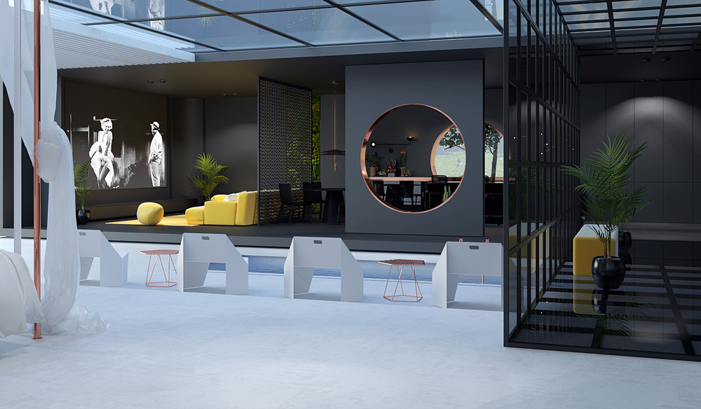 Поэтому и родилась идея этого дома - максимальное слияние с природой и уединение. Окна на фасаде дома почти отсутствуют , а свет попадает в дом через открытую центральную часть, которая при надобности закрывается . Дом визуально делиться на 3 части - открытая площадка с бассейном и зонами отдыха разделяет зону гостиной и кухни с зоной спальни. Также зоны разделены и по цветовой гамме - зона гостиной и кухни сделана в черном цвете , акцентом выступает диванная зона насыщенного желтого цвета. А зона спальни наоборот - вся светлая и легкая, а круглая кровать словно парит в невесомости.