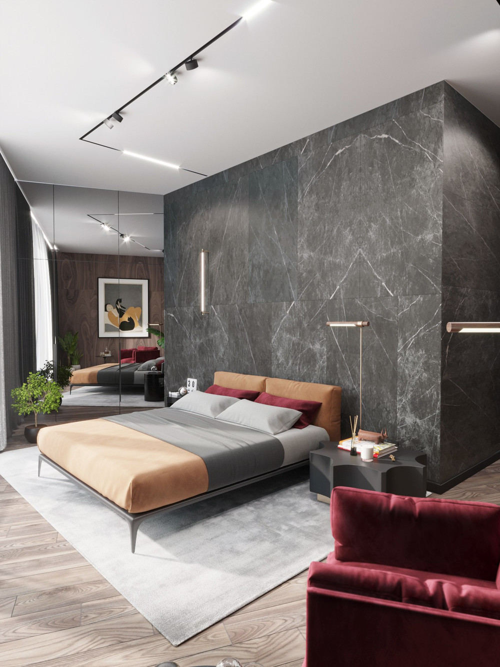 Каждая комната выполнена в собственном стиле и цветовой гамме. Строгие оттенки использованы в оформлении интерьера спален, а мягкие и светлые цвета преобладают в общих зонах дома. В интерьере используется большое количество натуральных материалов - массив дерева, природный камень и натуральная кожа в отделке мебели, что делает минималистичный интерьер теплым и уютным.