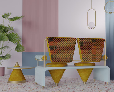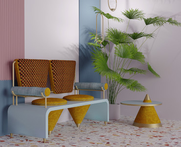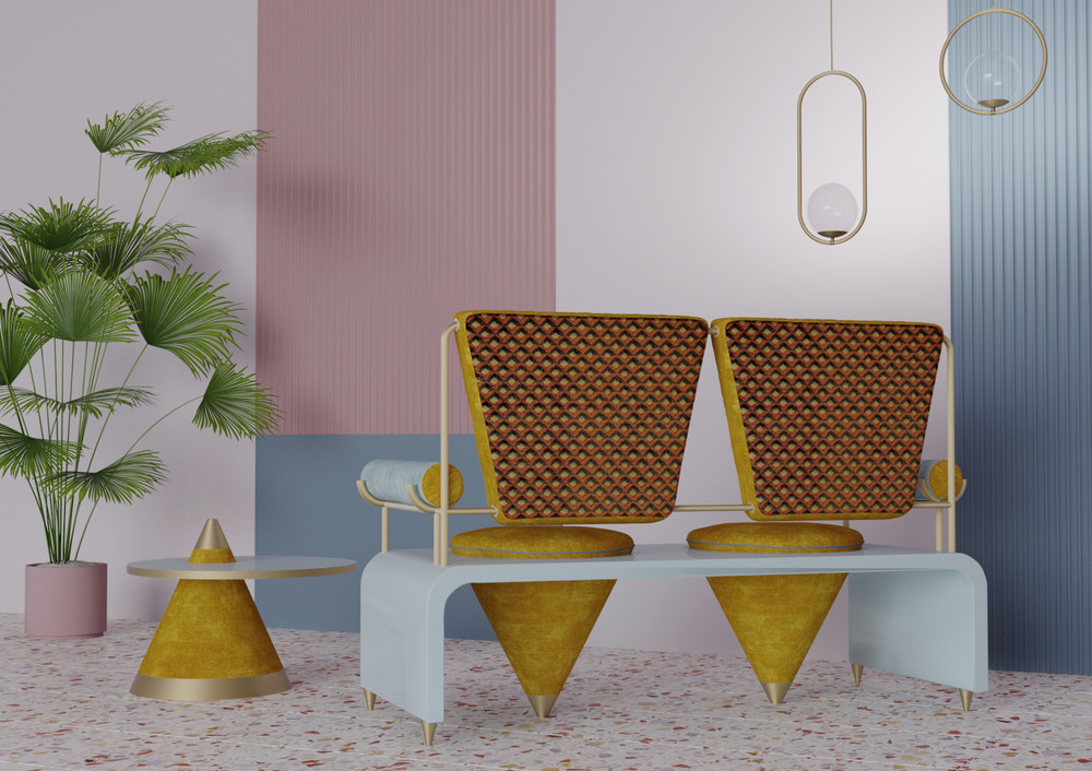В основу дивана из МДФ+пластик (цвета взяты из палитры красок Little Greene) вставляются два мягких сиденья конуса.