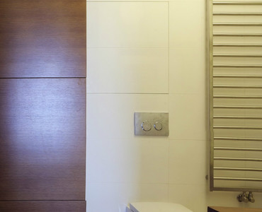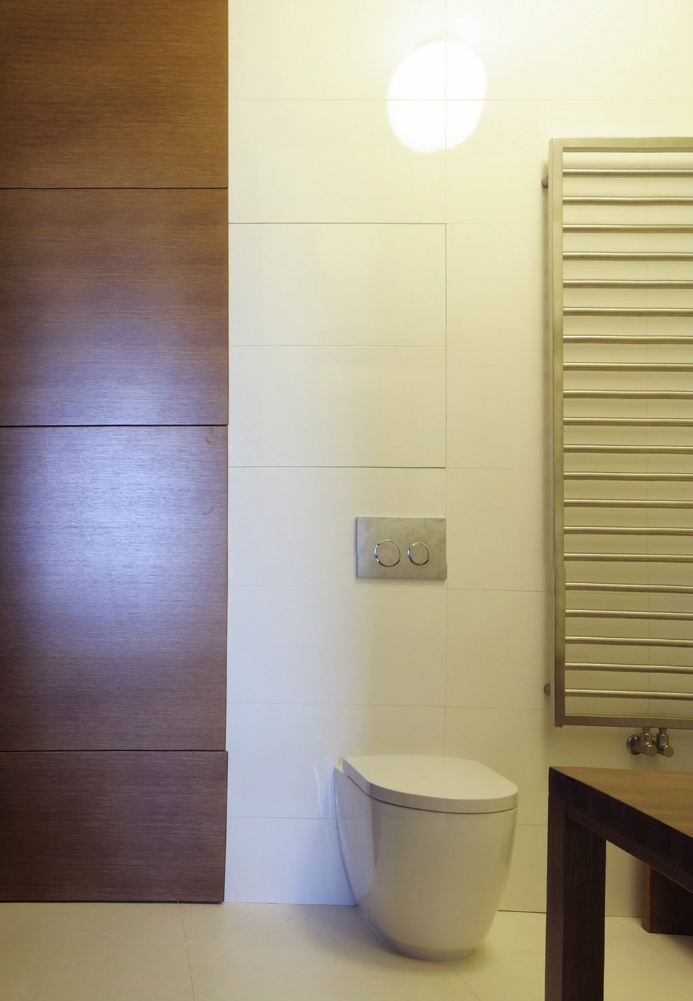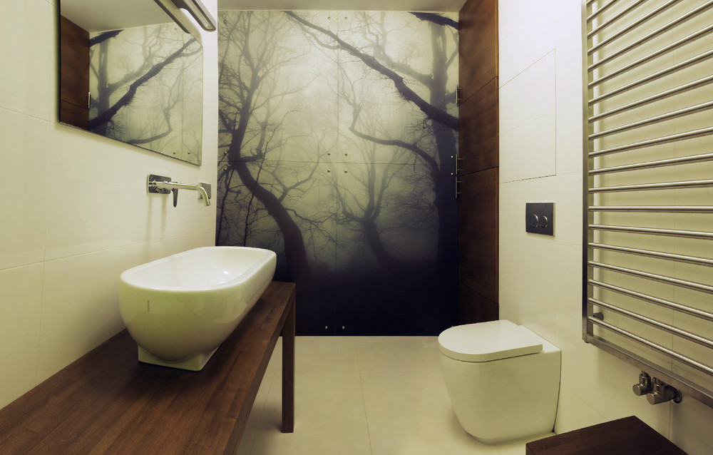 Одна стена в ванной отделана стеклом с химическим матированием, с напечатанной фотографией леса – при повышении влажности ветви проступают четче. Стиральная машина и бойлер спрятаны в нише за деревянными дверьми. Год реализации: 2012 Фотограф: Люся Толстова