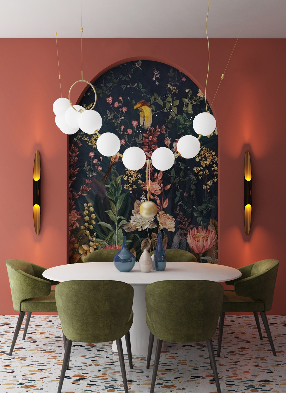 интерьер кухни-гостиной "Маленькая Италия", Московская обл. Заказчики- молодая пара, следящая за последними тенденциями и новинками в области дизайна, поэтому проект был разработан специально по их критериям. В интерьере использовались сложные оттенки коралла и зеленого цвета, а также была создана красивая композиция обеденной группы благодаря бесподобной люстре от канадских дизайнеров и завораживающей своей красотой фреске с природными мотивами. Дом заказчиков находится в пос. Маленькая Италия (Московская обл.)-отсюда и появилось одноименное название проекта. Архитектура дома уже диктовала направление для интерьера, потому что в фасаде здания присутствуют арки, поэтому интерьер и экстерьер коттеджа перекликаются друг с другом. Особое внимание в проекте было уделено различным сценариям освещения, а также зонированию- рабочее место, зона отдыха и обеденная зона.