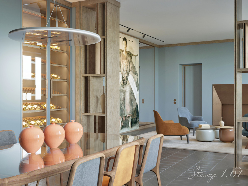 Кухонный модуль в нерабочем режиме маскируется выдвижными панелями, оставляя на обозрение лишь винные витрины- прекрасный предлог обсудить с любимым человеком за бокалом вина под легкую закуску события прошедшего дня.