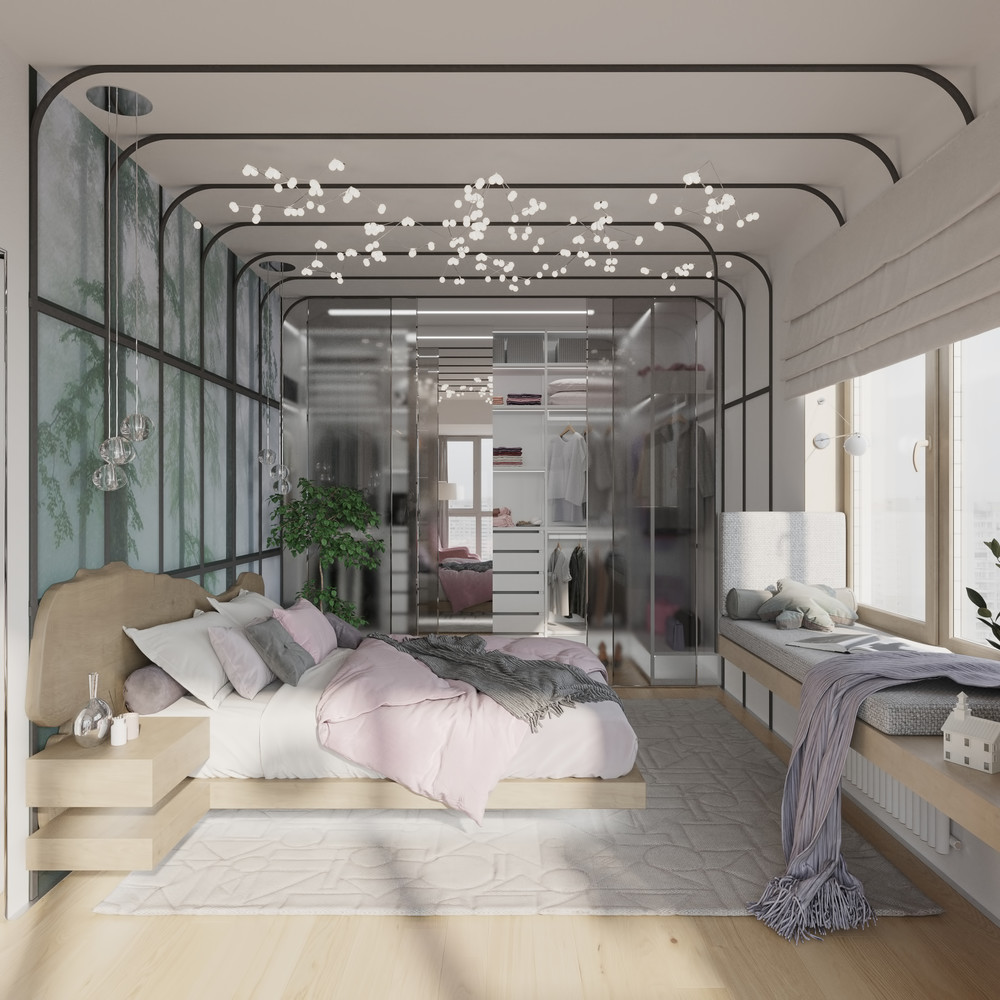 Со всех сторон ЖК Гринада окружен густым лесом, который можно лицезреть изо всех окон. И мы "завели" природу в наше пространство.. зеленью, натуральными цветами и материалами, а так же стеной с фреской изголовья кровати.