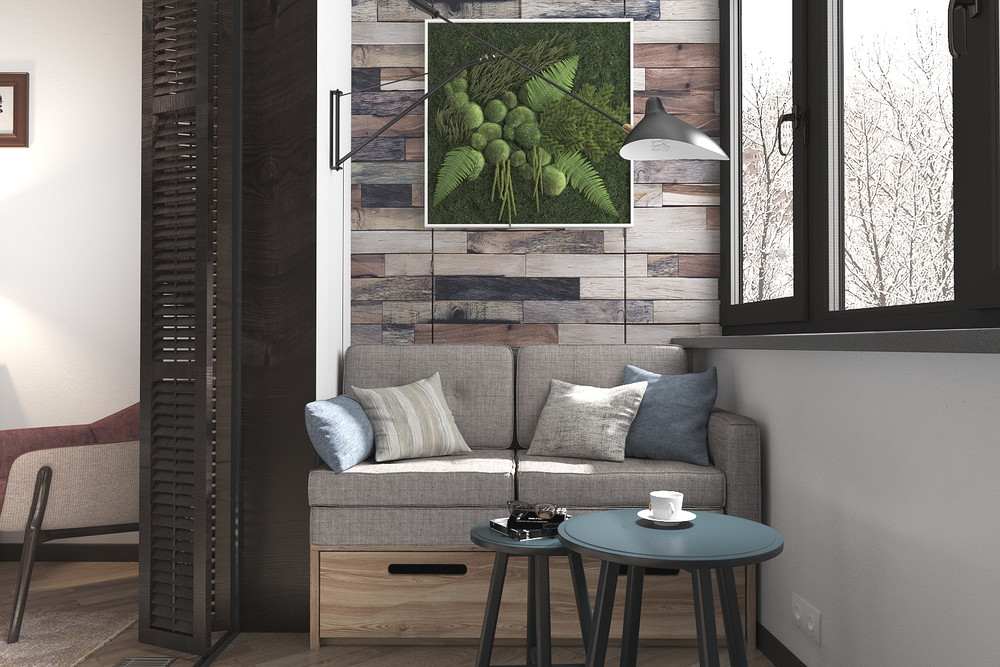 Общая площадь квартиры: 56 м2 Территориальное местоположение: г. Москва Год создания дизайн-проекта: 2020 г. Проект современной квартиры для молодого человека 26 лет. Планировочное решение индивидуально разработанное, учитывает уединенный образ жизни заказчика. Общая стилистика интерьера очень актуальна для нашего времени: в некоторой степени она скандинавская с добавлением стильных этнических предметов обстановки, от которых молодой человек просто в восторге, ведь он много путешествует и обожает жить в окружении восточных элементов дизайна. Помещение с огромным эркерным окном с самого начала планировалось, как просторная кухня-гостиная. В этой комнате возможно и отдохнуть, приготовить и принять пищу, посмотреть телевизор, послушать приятную музыку, даже очень продуктивно потрудиться, чему способствует прекрасный вид прямо напротив рабочего пространства. Контраст темного и светлого - основа колористической схемы разработанного интерьера с добавлением стильных и гармоничных цветовых акцентов. Двери и окна были запланированы очень темные, практически черные. Особенно выгодно этот контраст вписался в композицию оконной ПВХ-профильной системы Veka с верхним остеклением (Veka Spectral umbra ultramatt). Помещение спальни повторяет очень спокойную и гармоничную атмосферу интерьера всей квартиры. Балкон стал частью этой уютной комнаты. На нем была организована зона отдыха с маленьким диванчиком. На стыке этих двух пространств для условного разделения были монтированы жалюзийные двери с открыванием "книжка" в стиле европейских традиций создания интерьеров. Созданный нами дизайн-проект является 3D концепцией интерьера и в данный период времени реализуется заказчиками самостоятельно.