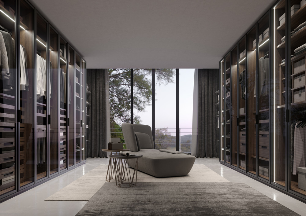 Шкафы и гардеробные Atlante Wind имеют стеклянные фасады в металлической рамке. Стекло может быть обычным, бронзовым или дымчатым. Отделку металлической рамки также можно выбрать под проект. Дизайнеру с помощью обширной гаммы комбинаций, возможностей и аксессуаров будет легко создать гардеробную, которая по всем параметрам подойдёт своему хозяину и послужит ему помощником и будет облегчать жизнь и дарить эстетическое удовольствие.