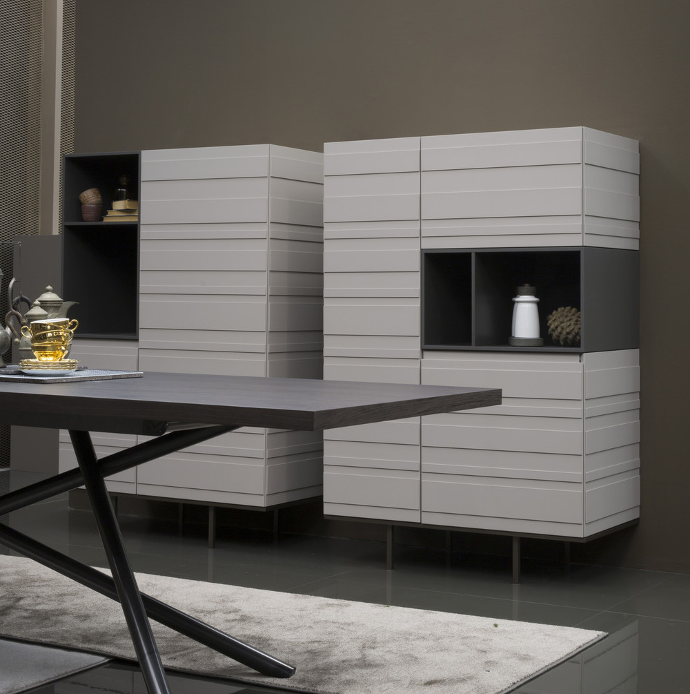 Это система комодов и тумб трёх различных высот: низкий шкаф идеально подходит для зоны TV, высокий может послужить отличным буфетом или сервантом, а средняя практичным комодом для любых зон. Вся коллекция характеризуется свойственной ей линиями, которые придают поверхности 3D эффект. Все модули можно сделать в различных размера и отделках.