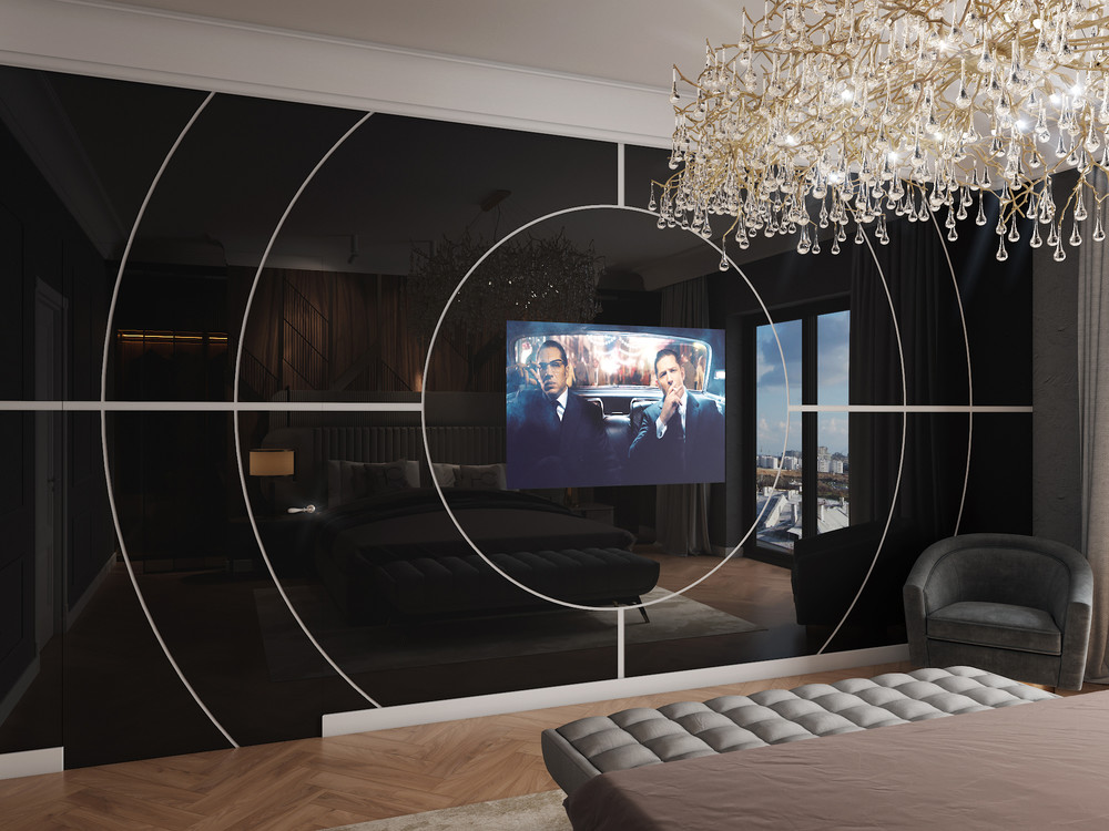 Спальня в стиле арт-деко создана для ценителей комфорта и качества. Функциональное зонирование представлено спальной зоной, гардеробной "walk-in-closed" и отдельной зоной хранения одежды и аксессуаров за изголовьем. Спальная зона представлена просторной кроватью в велюре. Гардеробная "walk-in-closed" обшита стеклом, за которым интегрирован встроенный телевизор со специальным экраном. Вся мебель и декоративная панель представлена в массиве дуба и шпоне американского ореха с вставками и фурнитурой из латуни. Все столярные изделия, использованные в проекте предусмотрены под заказ.
