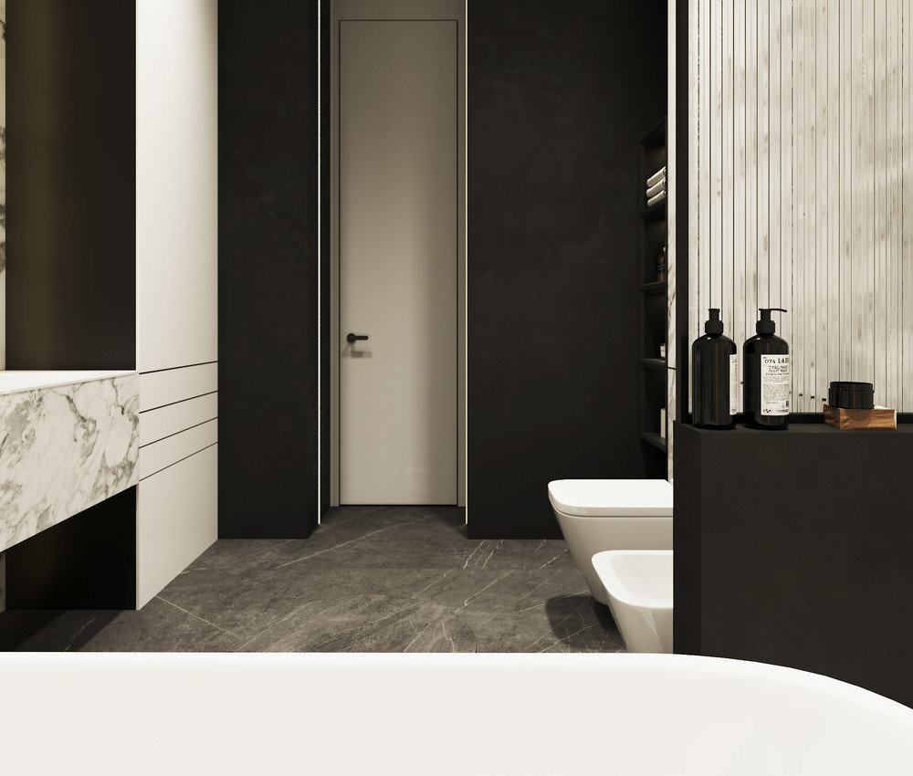 Мастер-санузел в загородном доме. В проекте присутствует сантехника и мебель для ванной комнаты Villeroy&Boch из коллекции Finion, а именно: ванна (Chrome), настенный унитаз, биде, раковина (1200 x 500 mm), 4 полки Finion в цвете Black Matt Lacquer, встроенные в нишу