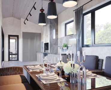 Заказчик обратился за проектом веранды, состоящей из обеденного пространства и рабочего кабинета, которая с торца примыкает к дому. Важно было предусмотреть всё для удобного пользования в теплое и холодное время года. Одним из основных пожеланий была открытость архитектурного решения, с учётом современных стандартов энергоэффетивности. В качестве конструктивного решения была выбрана каркасная система, на основе стальных стоек 100х100мм и деревянных ферм перекрытия. Нагрузка равномерно распределяется и передаётся на буронабивные сваи. Водяное отопление пола и стеклопакет SOFTLINE 82 для окон и межкомнатных дверей – основа стабильной и комфортной температуры в помещении, а порог GU-THERMOSTEP с терморазрывом обеспечивает непрерывный тепловой контур. Семья заказчика много времени уделяет украшению своего сада, здесь же впоследствии будет обустроена детская площадка. Было важно минимизировать визуальные препятствия между верандой и пространством сада. Поэтому, в проекте заложена система раздвижного панорамного остекления VEKASLIDE 82 с параметрами створок 2500мм х 2100мм (Ш х В). Это решение обеспечивает идеальную просматриваемость всей садовой территории. Многозапорные замки GU-SECURY ADR для раздвижного остекления обеспечивают безопасность веранды. Несмотря на внушительные размеры и вес двери, фурнитура GU позволяет даже самым маленьким членам семьи открывать створку без особых усилий. Дверные ручки GU и ракушки модели BELCANTO цвета «серебро» были подобраны для раздвижного панорамного остекления и для межкомнатных дверей. Покрытие VEKA SPECTRAL оттенка anthrazit ultramatt продолжает темную отделку фасада, дополнительно выделяя панорамное остекление. А в интерьере, темный контур профилей VEKA является контрастным элементом, удачно подчеркивающим пропорции помещения.
