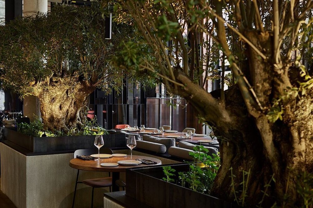 В оформлении использованы массивные плиты из металла, характерные светильники и большое количество меди – более 12 тонн. Мрамор, которым облицована барная стойка, доставлен из Карелии. Интерьер Ognivo украшают столетние оливы, привезённые в Петербург из Сицилии.
