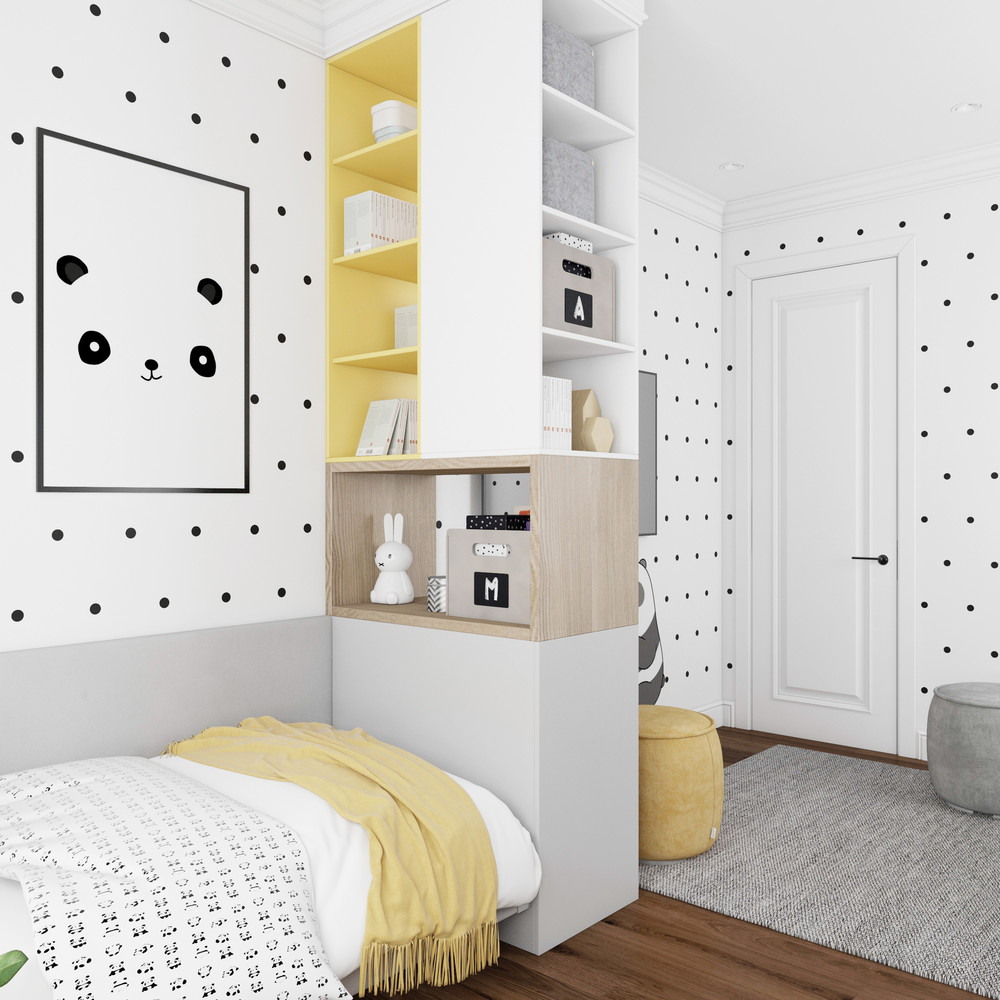 Детская комната 15.5 кв.м. Основным цветом выбран белый, в качестве акцента желтый цвет, дерево и интересные интерьерные детали. В комнате есть различные зоны для отдыха, учебы, сна и пр. За зеркальной раздвижной дверью располагается вместительный гардероб.