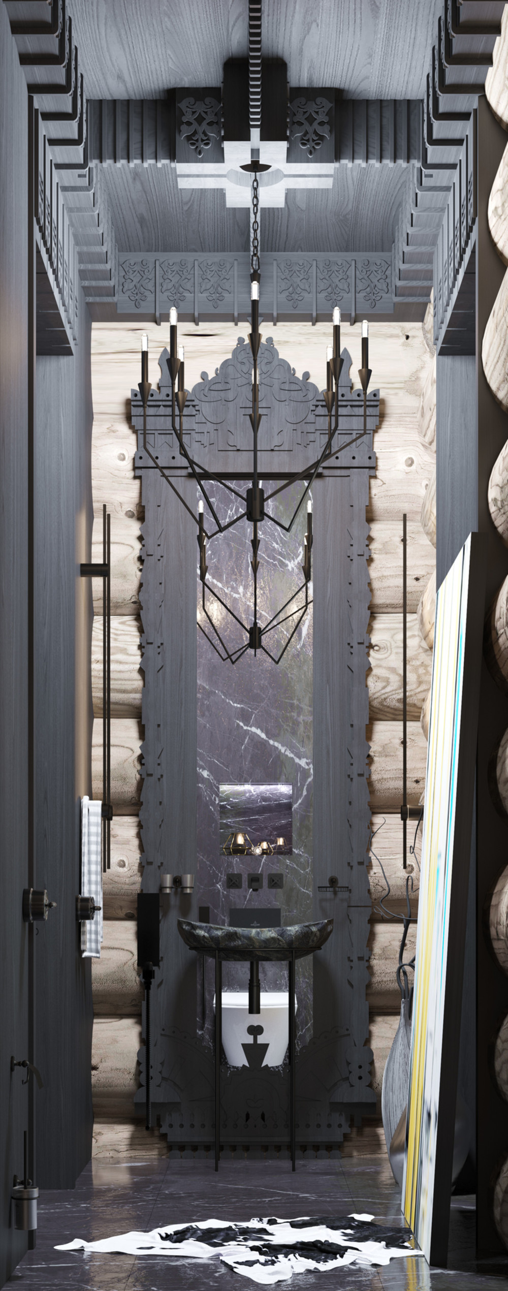 Гостевой санузел с выходом из небольшой гардеробной комнаты с зеркальным шкафом во всю стену в частном доме из КЕЛО. Интерьер создан с применением контраста натурального дерева и темно-серого с элементами русского узорочья. Все материалы только натуральные - дерево, камень, металл, стекло. Раковина выполнена из окаменелого дерева на металлическом подстолье. За дверью, частично закрытой картиной, располагается шкаф для коммуникаций и сантехнического оборудования.