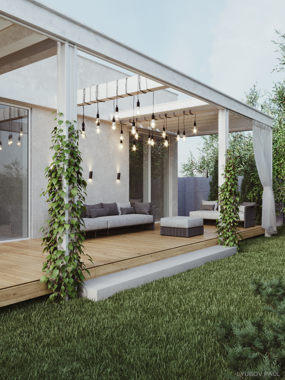 Представляю вашему вниманию проект частного дома в стиле минимализм 120 кв.м., с эксплуатируемой кровлей. Мечта заказчиков данного проекта- легкий, воздушный дом с панорамными окнами. В проекте использованы пластиковые окна и двери компании VEKA в белом цвете. Панорамные двери VEKASLIDE украшают зону барбекю и зону отдыха с диванами. Кроме того, в проекте использован профиль Artline. И фурнитура от компании Gretsch Unitas. Данные продукты позволяют создать единый ансамбль стиля. Важным архитектурным элементом является лестница на эксплуатируемую кровлю, она придала фасаду динамики и стала отличным функциональным дополнением.