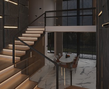 Огромные панорамные окна Veka Softline82 в цвете Тёмно-серый гладкий с ручками в цвете Титан стали важной архитектурной деталью интерьера. Все остальное стало поддержкой и продолжением природных мотивов: деревянные рейки на стенах и потолке, красивый натуральный камень в зоне ТВ, брутальная отделка камнем лестничного холла и много-много света. Мы любуемся проектом и ждём его реализации.