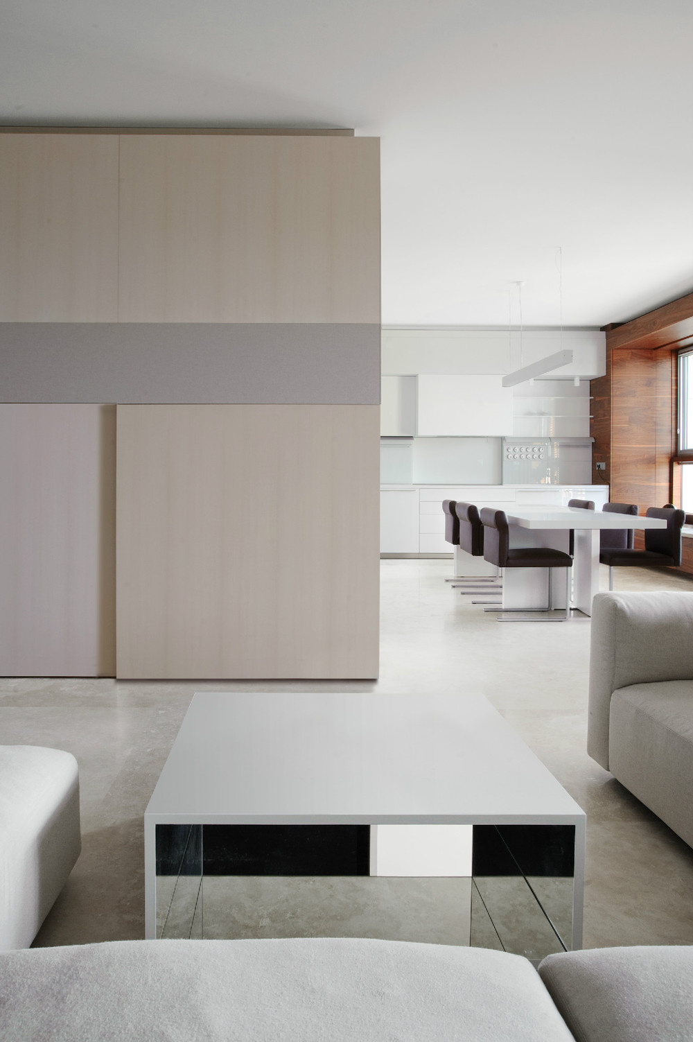 Бюро АИ-Студия. Квартира в Москве, площадь 200 м2. Проектирование - 2010 г., реализация - 2011 г. Заказчик - меломан. Все функции жизнедеятельности человека в этом интерьере спрятаны в угоду спокойному восприятию простых пустых объемов. Основное освещение решено сверхмощными диодными линейками, спрятанными от взора, заливающими помещения равномерным амбиентным светом. Отделочные материалы натуральны и экологичны, членения сомаштабны габаритам помещений. Авторский коллектив: Сошников Василий, Колманок Иван, Воробьева Ксения, Федосеенко Петр, Томашенко Александр.