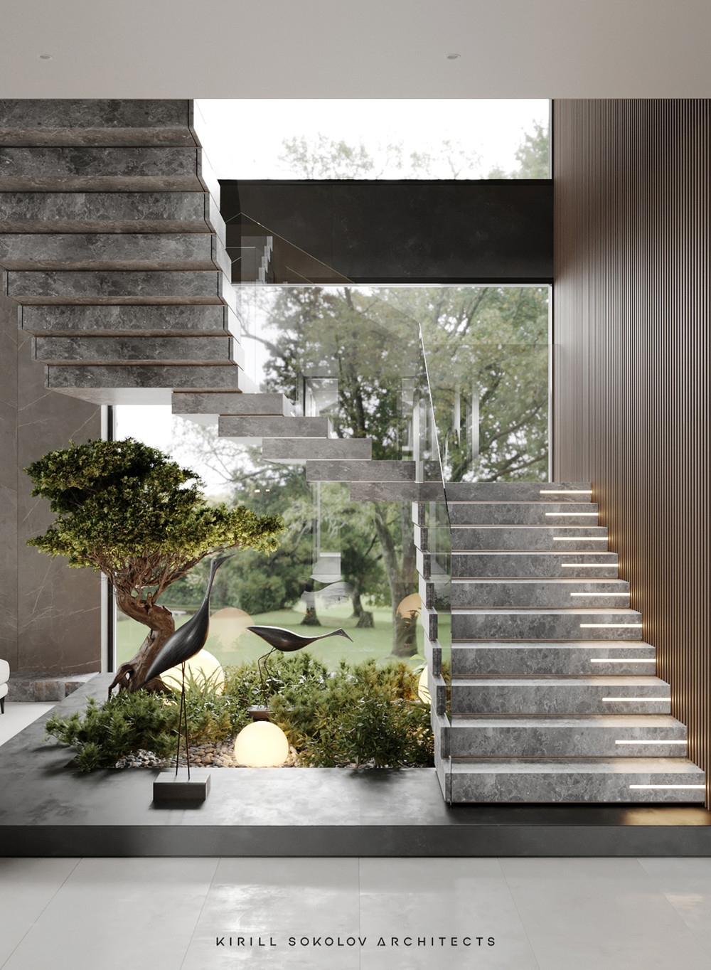 Стильный, современный интерьер обретает свою индивидуальность благодаря успокаивающей оттеночной гамме, объектам арт-искусства, обилию дерева и камня, большим открытым пространствам, где много воздуха и света. В такой дом всегда будет приятно возвращаться.