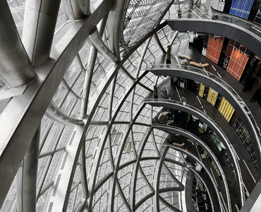 Здесь, в этом интерьере, каждый угол, каждая линия словно утоплены в бездонных измерениях гиперсферы, раскрывая перед взором мир, где гармония пространства и времени становится бесконечно прекрасной и загадочной. На фото: интерьер выставочного центра EXPO в Астане