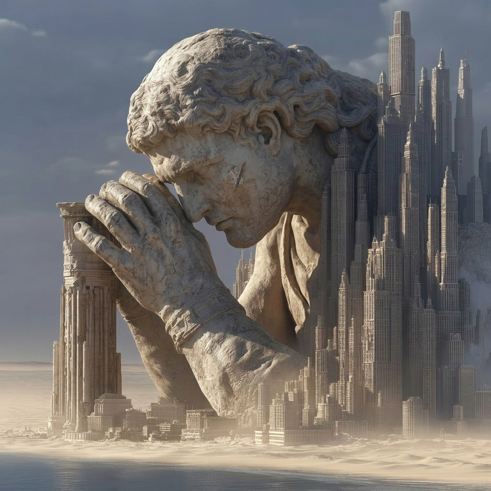 Плечи Атлантов стёрты, но не временем — тяжестью. Они несут не просто бетон и стекло. Они несут на себе саму идею совершенства, которую люди построили над их головами и вокруг них.