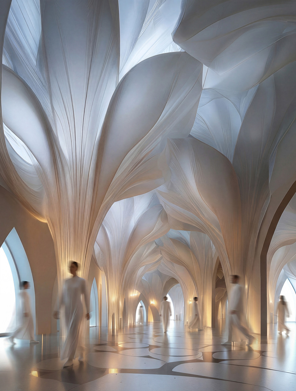 Эта работа отражает эфемерное стремление архитектора создать что-то возвышенное, подобное природе, но застывшее во времени. Колышущиеся ткани арочных сводов демонстрируют непостоянность конструкций и иллюзорность создания монументальных идеалов на сегодняшний день. Но мы не отказываемся от прекрасного и поиска совершенства, а адаптируем его путем создания изменчивых форм, внедрения новых материалов, создавая меняющиеся и адаптивные здания и гибкую среду.