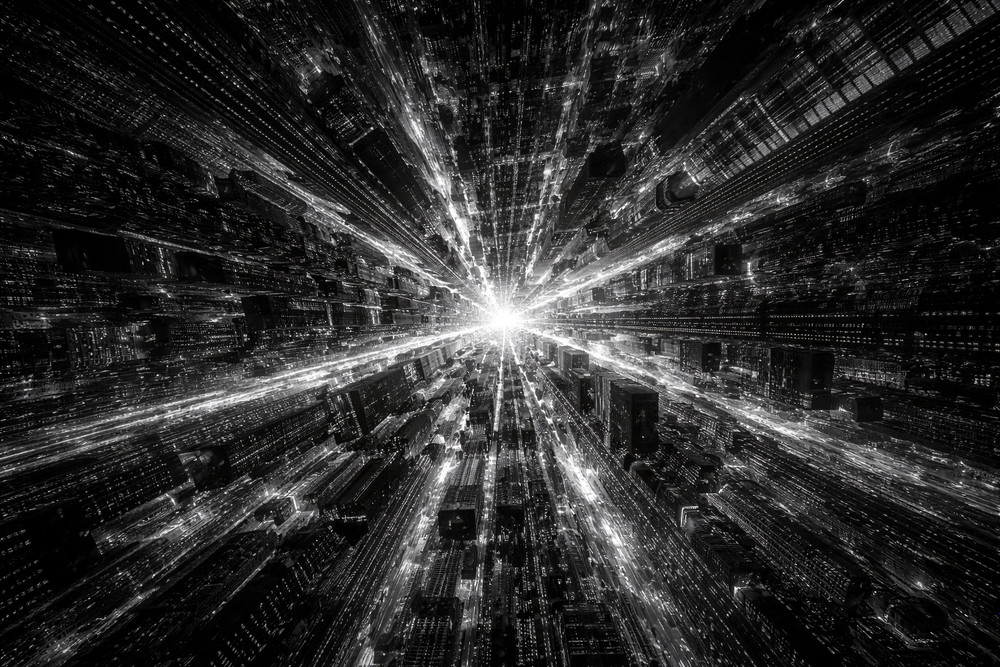 В этой работе я переворачиваю привычный взгляд на город: вместо горизонтального пейзажа — бесконечный вертикальный туннель, устремлённый ввысь. Съёмка строго снизу вверх создаёт эффект «падения в небо», где небоскрёбы сливаются в единый пульсирующий организм из стекла, бетона и света. Чёрно-белая палитра убирает всё лишнее, оставляя только ритм линий, контраст теней и ослепительную точку-сингулярность в центре. Город здесь — не фон, а самостоятельная сущность, поглощающая пространство и масштаб человека. Это визуальная метафора современного существования: эпоха вертикального роста, где горизонт исчезает, а вертикаль становится бездонной. Свет на фасадах превращается в живые вены мегаполиса, а тени — в паузы, напоминающие о хрупкости этой иллюзии бесконечности. Работа передаёт двойственное чувство: восторг перед мощью человеческого творения и тревогу перед подавляющим масштабом. Зритель оказывается в эпицентре вихря — одновременно свидетелем триумфа и его потенциальной жертвой. Фотография не фиксирует реальность, а создаёт новую: город как космический портал, молчаливый и завораживающий, ведущий куда-то за грань — к звёздам или в собственную бездну.
