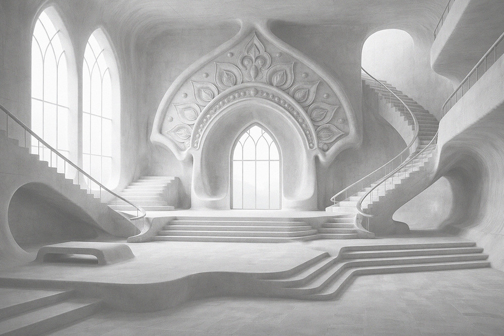 Интерьерное пространство «Архитектура памяти» — это белый зал, застывший, словно мысль, на миг остановившая мгновегие. В центре композиции — традиционный русский мотив: кокошник-наличник, вырезанный из той же самой материи, что и стены, — не просто декоративный фрагмент, а знак сопричастности с прошлым. Он является символом памяти обращенным в пространство: его лепестки и узоры повторяют ритмы народного орнамента и одновременно гармонично вписывается в интерьер подчиняя себе свет, делая его мягче, словно сквозь толщу веков. Традиция не внедрена как музейный экспонат, она встроена в саму структуру интерьера, как несущая опора, которая поддерживает его целостность.
