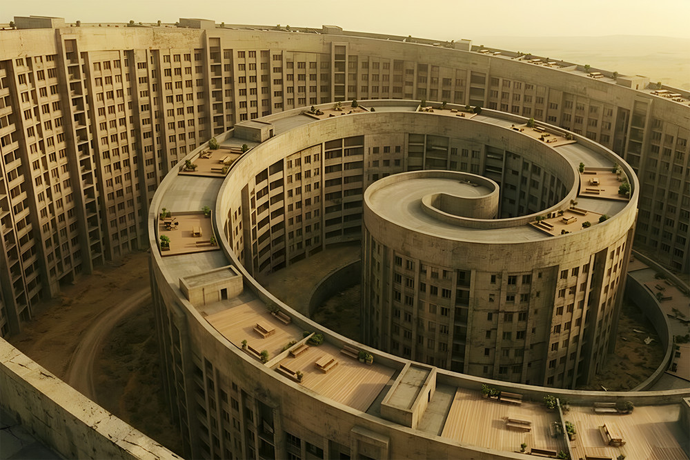 Спираль – это траектория точки, которая одновременно вращается вокруг центра и движется вдоль радиуса. Ее движение описывается строгими уравнениями. Но когда спираль становится зданием, во время строительства уже трудно уследить за идеальной геометрией. Иллюзия совершенства в том, что мы верим: построенное в точности повторяет задуманное. Генерация изображения: Nano Banana 2 (Gemini). Постобработка: Adobe Photoshop.