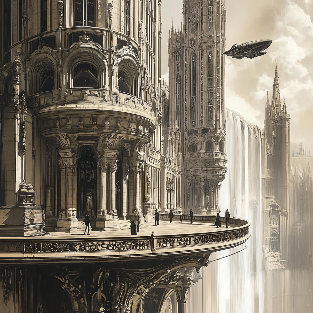 Гигантский многоуровневый мегаполис, построенный тысячи лет назад на вершине колоссальной скалы, которая обрывается в вечную туманную пропасть. Нижние уровни — лабиринт из ржавого железа, шестерёнок и готических арок, где живут рабочие и клан «Нижних». Средние — торговые террасы и мосты с каскадными водопадами, питающими паровые машины. Верхние — роскошные дворцы и башни со шпилями, уходящими в сепиевое небо. Всё дышит паром, медью и меланхоличным величием. Город держится на древней технологии «Эфирного Ядра» — огромном реакторе в сердце скалы. Но Ядро медленно умирает. Туман в пропасти поднимается год от года. Ещё несколько десятилетий — и Шпиль рухнет. Инструменты - Midjourney
