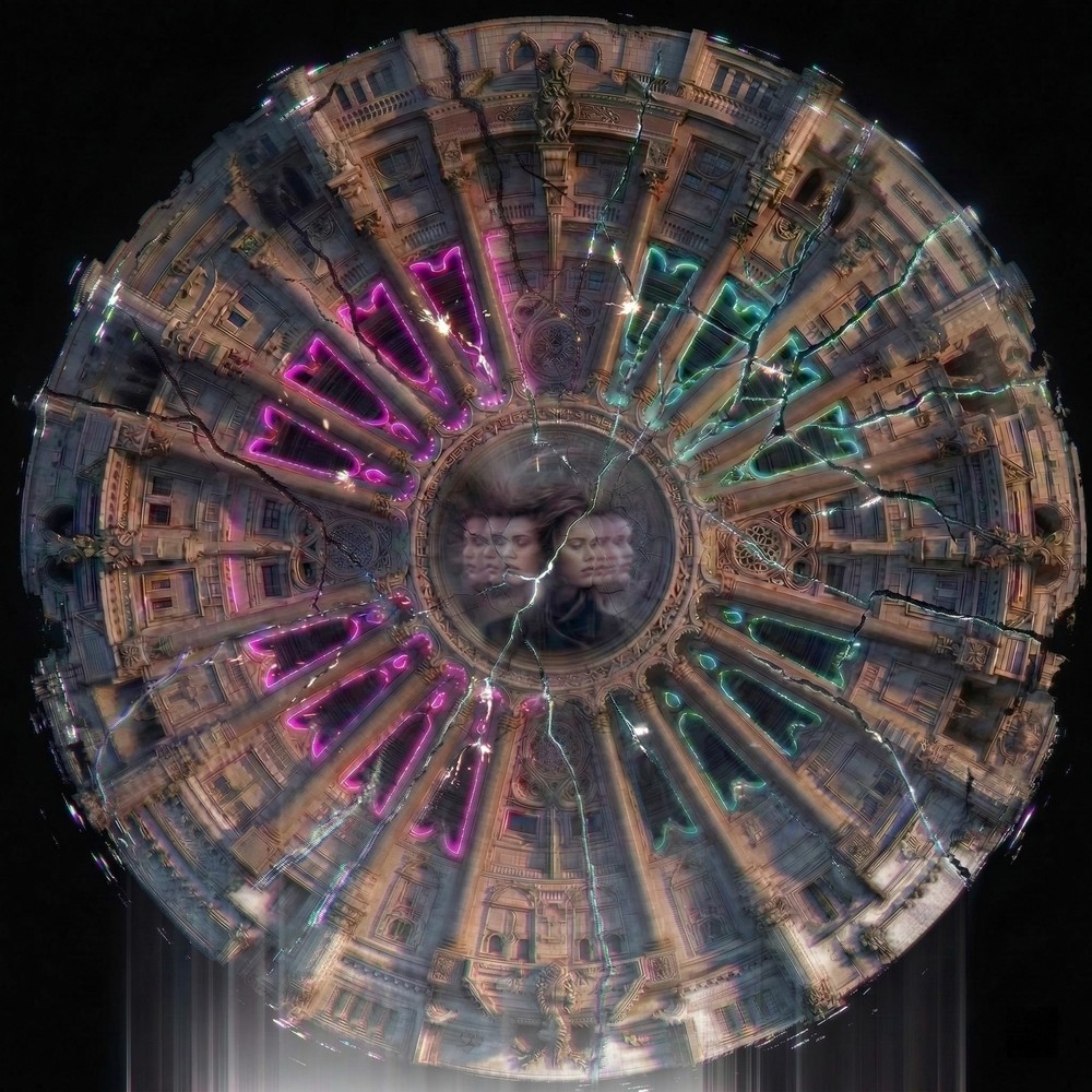 Классическая архитектура сворачивается в идеальный круг — иллюзия абсолютного совершенства и устойчивости. В центре — множественное лицо, разорванное на версии себя. Неоновые контуры цифрового пространства прорываются сквозь физическую форму.