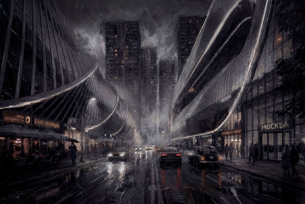 Небоскребы, еще недавно обозначавшие власть денег, привилегий и права смотреть на город сверху вниз, лишаются своей привычной неприступности. Они словно склоняются перед тем, что долго существовало как молчаливое большинство, возникает архитектурная инверсия: низ становится верхом, а символы превосходства оказываются поставлены в жест почти ритуального поклонения. Образ новых доминант становится символом возвращения вытесненного, восстания против парадного фасада города. Именно они, а не стеклянные башни, оказываются подлинными хозяевами Москвы. Дождь смывает с асфальта следы прежнего мира и глянец недоступной жизни. Воздух наполнен не парфюмом роскоши, а влажностью асфальта и ожиданием перемен. Но сквозь тяжелое небо уже начинают пробиваться первые лучи солнца, еще слабые, но достаточные, чтобы стало ясно, что наступает новый мир. Каким он окажется, справедливым или столь же противоречивым, как ушедший, неизвестно. Картина оставляет зрителя в пространстве исторической неопределённости предлагает пофантазировать над миром, который изображен на картине. Инструменты: nanabanana2 и chatgpt