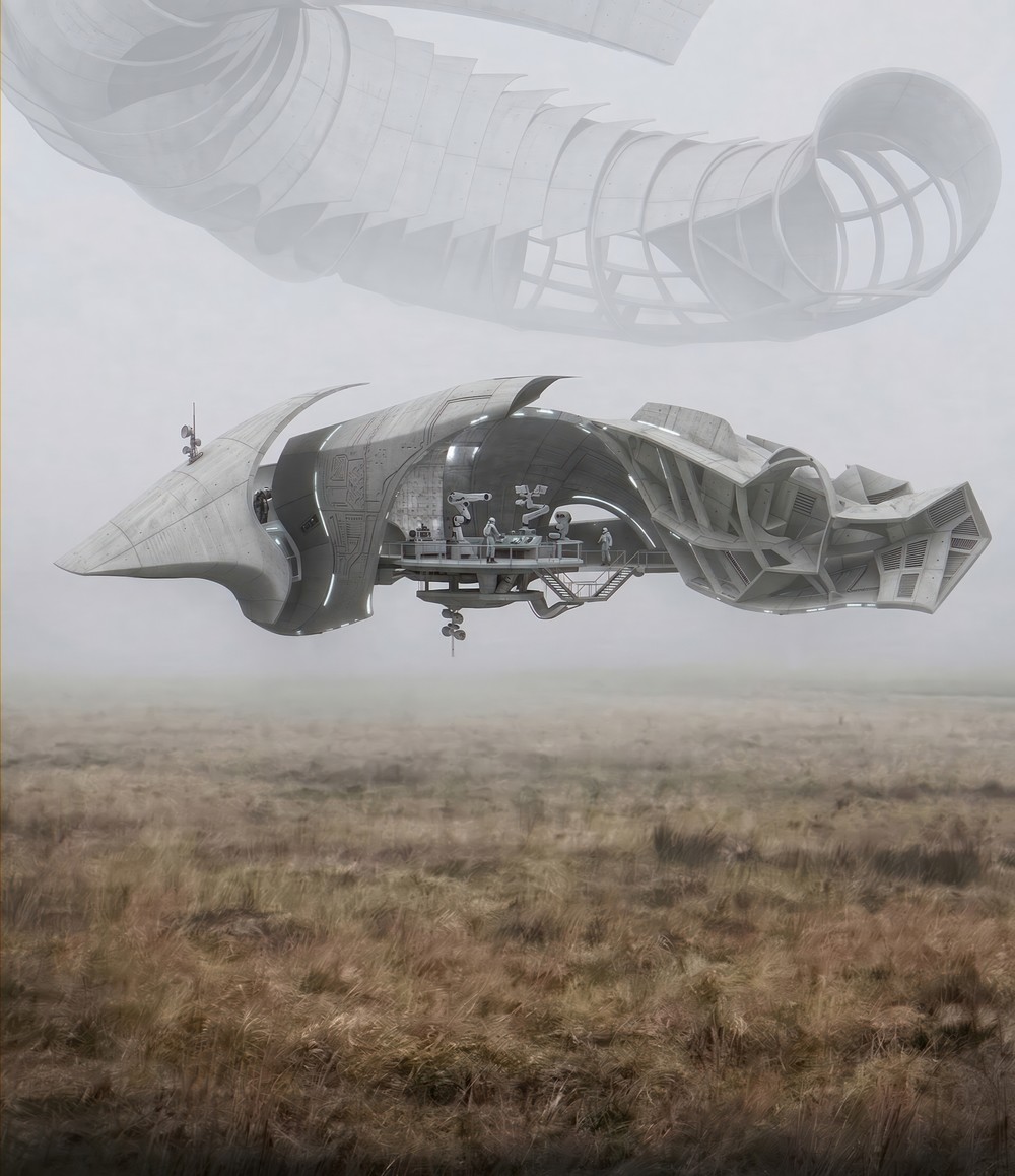 (Изначальная композиция была сформирована в Photoshop. Далее нейросетью были добавлены общая атмосфера, реалистичность материалов и детали). Название работы - "Левитация". Иллюзия совершенства показана, как туманная пустота между парящей в небе конструкцией в виде загадочной трубы и нетронутым полем, символом естественной для живых существ на планете средой обитания. Человек стремится создать обособленную, но в то же время идеально вписывающуюся в ландшафт архитектуру. В центре композиции - левитирующая конструкция, представляющая собой стилизованный собирательный образ современной архитектуры. Антенна, направленная вниз ловит сигнал от планеты, уведомляя архитекторов о данных предпроектного анализа территории. Антенна, направленная вверх распознаёт сигнал совершенно иной природы - внеземной, космической. Необычная и ни на что не похожая, загадочная конструкция - труба, прячется в тумане неба. Это метафора неизвестного и далёкого разума, который влияет на наше сознание, наделяя стремлением эстетизировать конструкцию и придавать пространству новые смыслы. Человек сможет приблизиться к идеальной архитектуре, если будут синтезированы в один замысел стремление к красоте и технологичности внеземного происхождения и фундаментальные требования, продиктованные средой нашей планеты. Спроектированный человеком мир находится в постоянных попытках достижения левитации между амбициозными стремлениями и земной реальностью. Собирательный образ современной архитектуры напоминает живое существо, ищущее своё место в туманах совершенства между земным полем и неземным разумом. Nano Banana Pro 2K с последующей пост обработкой в Photoshop