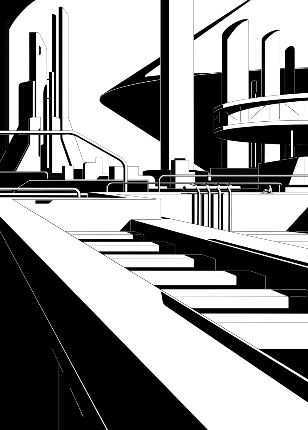 Иллюстрация посвящена моим впечатлениям от масштаба и архитектуры Алабяно-Балтийского тоннеля, который расположен неподалеку от моего дома в Москве. Оказавшись возле него впервые во время одной из летних прогулок, я долго изучала его, напитываясь масштабом брутальных форм. Я рассматривала ритмы балок и конструкций, вдохновлялась строгой светотеневой геометрией. Вибрации от проезжающих внизу автомобилей создавали напряжение, отчего еще загадочнее и строже казались чистые бетонные поверхности, залитые солнцем. Однажды я решила воплотить те первые ощущения и нарисовала иллюстрацию, в которой героиня предстаёт жительницей сурового индустриального города, а тоннель становится масштабнее, сливаясь в единый архитектурный ансамбль с вымышленными футуристическими сооружениями чистых и строгих форм, уходящих далеко за пределы кадра. Работая над композицией иллюстрации, я представляла её фрагментом многоуровневого пространства города, уходящего и вниз, и вверх.