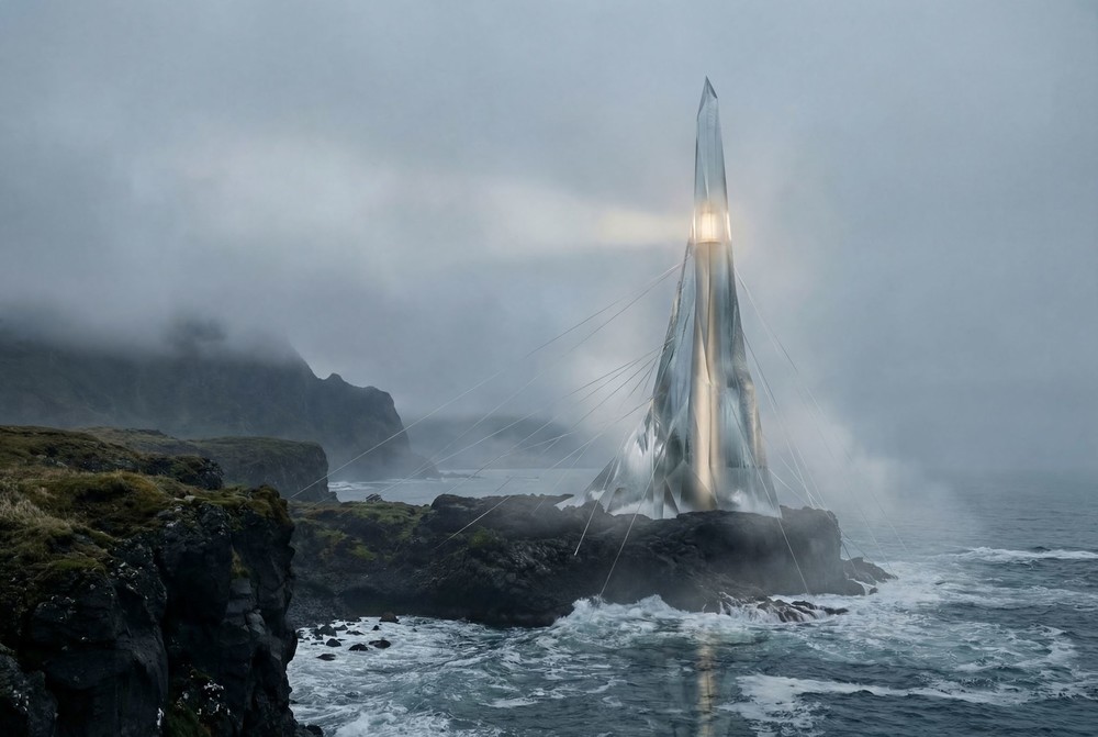 Вдохновляясь образами природы и местоположением, рождается понимание, что необходим ориентир, который станет источником энергии, местом силы и надежды. Решением стал маяк, втиснутый в кристаллическую башню, распространяющий свои лучи для мореходов. Материал дает архитектурному объему стать частью ландшафта: днем растворяется в скалах, становясь продолжением; ночью же он заявляет о себе светом, преломленным в гранях.