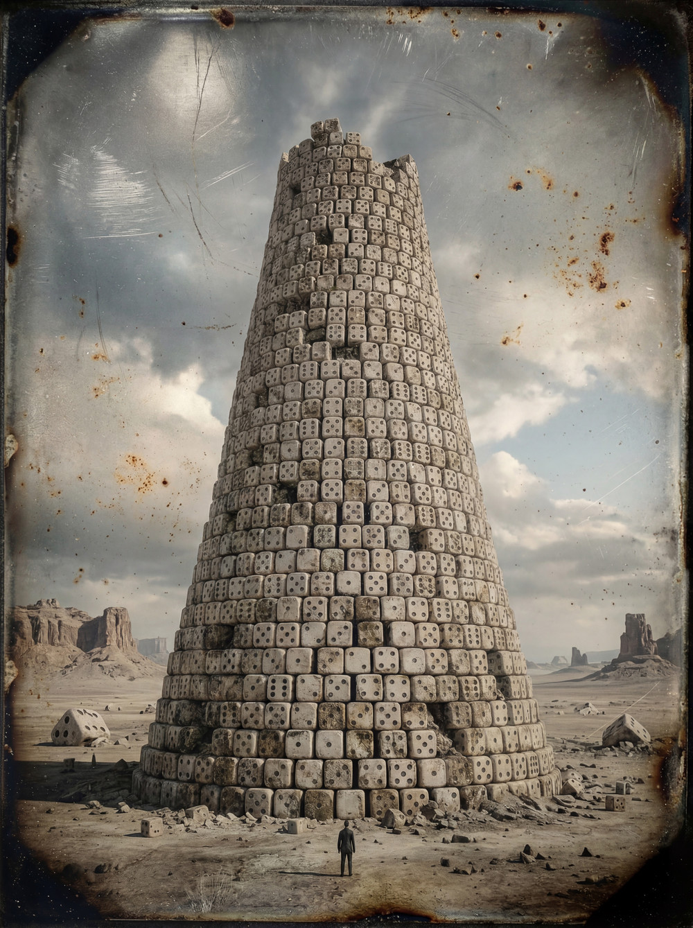 Башня, сложенная из игральных костей, выстроена как безупречная форма — строгая, симметричная, почти монументальная. Она воспринимается как завершённая архитектура, в которой всё подчинено порядку и вертикали.