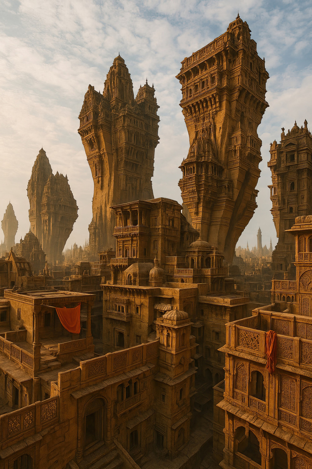 Аллюзия на фантастический фильм «Дюна». Архитектура, как будто выдавленная из песка и времени. Город не построен, он сформирован давлением среды, где форма подчинена жаре, ветру и длительности. Башни тянутся вверх, как деформированное усилие, а плотная ткань улиц скрывает жизнь внутри. Это не пространство для человека это пространство, в котором он выживает.Инструменты: сделано в Midjourney по мотивам карандашного рисунка в адаптации к произведению «Дюна» Фрэнка Герберта.