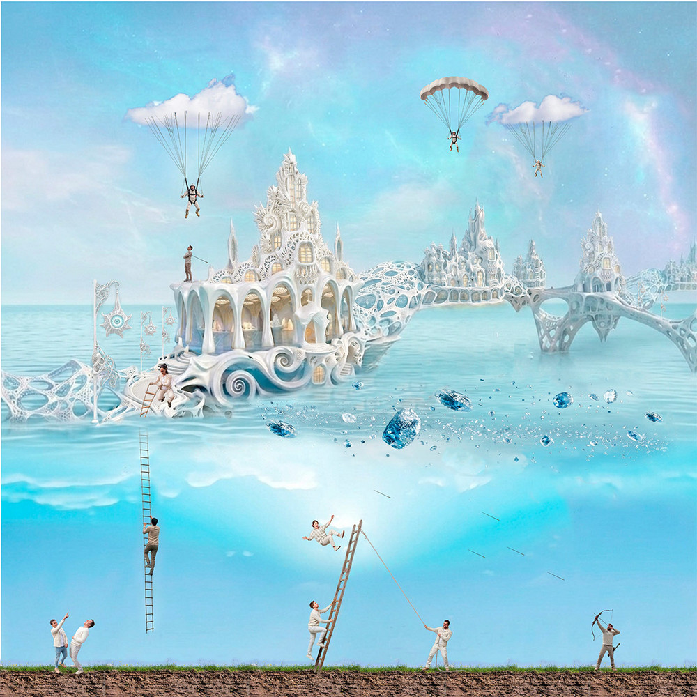 Многие изобретения, которыми мы пользуемся сегодня когда-то считались чем-то немыслимым и даже сумасшедшим. Например, система доставки на дом изобретённая Рафаэле Эспозито. Его современники считали эту идею абсурдной, но тем не менее на сегодняшний день доставка товаров на дом распространена по всему миру. Джордано Бруно, итальянский философ был сожжён на костре инквизиции за свои труды. И подобных примеров сильных духом, разумных и волевых людей в истории множество. В данной работе сказочный город символизирует ту самую прекрасную цель сильных и смелых людей, о которых ранее шла речь. Расположение города одновременно и в море и на небе подчёркивает недостижимость и безумство этой цели с точки зрения многих людей. Глядя на расположение города хочется сказать: «этого не может быть!». Но именно к этому самому «невозможному» стремятся те, кто карабкается по лестнице или взлетает на параплане. Конечно, им пытаются всячески мешать: то стягивают лестницу верёвкой, чтобы она упала, то стреляют из лука в желающих долететь до этого прекрасного города на параплане, то осуждают и смеются, показывая на них пальцем. Но несмотря на все эти козни сильные люди не сдаются и всё равно идут к своей цели, даже изобретают изощрённые способы как её достичь. Например, используют облака в качестве парашютов, проявляя нестандартный подход к решению проблем. Помимо людей, строящих козни, у сильных людей бывают и другие препятствия. Это может быть нехватка денег на реализацию проекта, семейные обстоятельства или политические события. Эти препятствия на данной работе символизируют глыбы льда, падающие из города на головы тех, кто в него стремится. Путь к невозможному, тернист и, порой, опасен. Помимо препятствий на пути встречаются люди, готовые предложить свою помощь, поделиться своей мудростью, дать дельный совет. Одна из таких людей – женщина, сидящая у крыльца здания. Она спустила верёвочную лестницу вниз, чтобы помочь другим людям добраться до города. Верёвочная лестница в данном случае – это символ накопленного жизненного опыта, которым эта женщина делится с теми, кто готов её услышать. А, ведь, далеко не все ценят оказанную помощь и полезные советы. Есть люди, воспринимающие помощь, как должное и вместо благодарности ещё и унижают тех, кто им помог. Мужчина стоящий на одной из арок здания, достаточно натерпелся подобных унижений и больше никому не желает помогать. Вонзенная в спину стрела символизирует унижения. Когда-то он тоже спускал верёвочную лестницу вниз. Но не нашёл ни одного человека, который был бы ему благодарен.