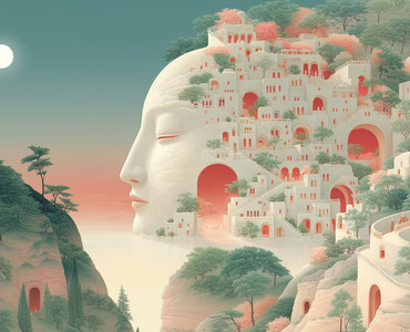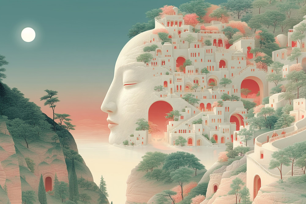 На изображении перед нами возникает фантастический ландшафт, в центре которого — гигантская голова с закрытыми глазами, словно погружённая в глубокое внутреннее созерцание. Её поверхность превращена в сложный архитектурный мир: террасы, лестницы, арки и здания, выстроенные в идеальной гармонии. Всё кажется безупречно продуманным — мягкие линии, чистые формы, пастельные цвета, создающие ощущение покоя и завершённости. Этот «город внутри головы» выглядит как воплощение утопии, где нет хаоса, случайности или разрушения.