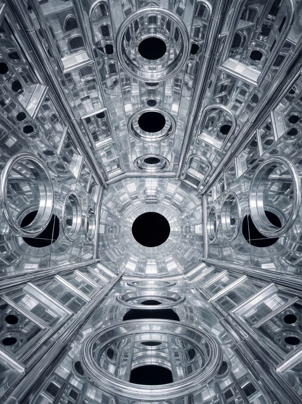 Отражения в этой структуре намеренно “некорректны”: они нарушают привычные оптические законы, создавая эффект симуляции, а не реального зеркала. Это подчёркивает внутренний сбой в самой идее идеальности — пространство начинает отражать не окружающий мир, а собственную иллюзию.