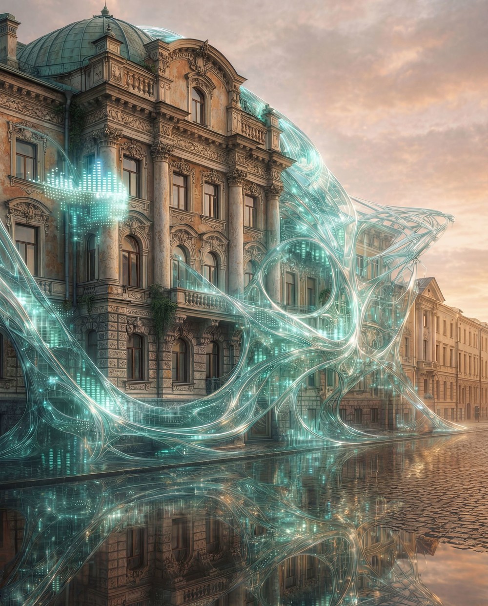 На этот исторический дом «надета» полупрозрачная музыкальная оболочка — пространственная метафора звука города. Её форма напоминает застывшую спектрограмму: в одних местах объём уплотняется, образуя «громкие» кластеры вокруг окон и колонн, в других почти исчезает, оставляя визуальные паузы и тишину. Оболочка ведёт себя как идеально отредактированный трек, который пытается выровнять и приглушить реальный шум улицы.
