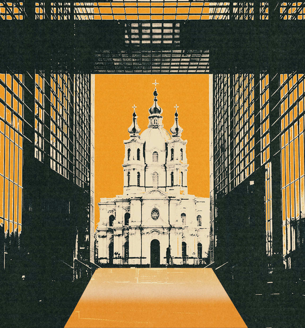 За основу взят кадр Смольного собора. В ИИ сгенерировано окружение. В фотошопе сделана цветокоррекция и коллаж.