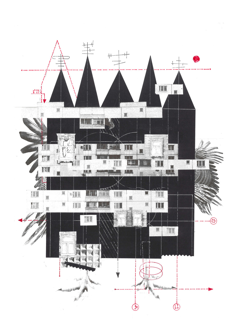 ЖК «Яга-Парк». Летающая панельная изба - метафора архитектуры, которая может оказаться в любом пространстве, но её "совершенство" - лишь иллюзия адаптации, за которой скрывается невозможность пустить корни. Бумажный коллаж, цифровой коллаж.