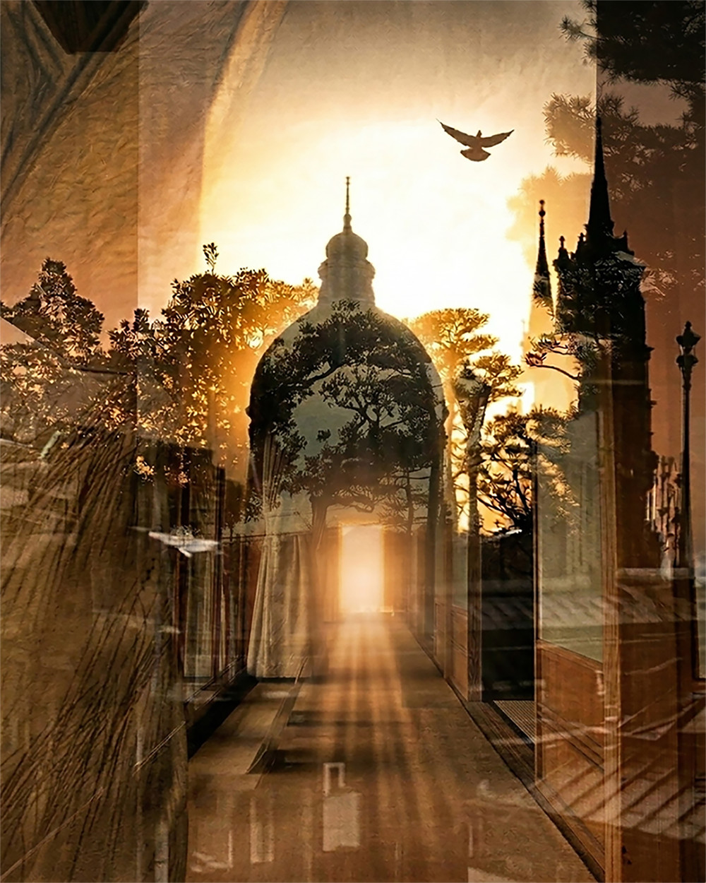 Кадр строится на метафоре стекла: в нём одновременно отражаются свет, луч , дающий ощущение веры, устремлённости ввысь .Но отражение - это символ ограниченности человеческого восприятия, которое неизбежно искажает источник. Архитектура в этой логике становится инструментом преодоления разрыва, указывая на тонкие закономерности. Она формирует реальность, здоровую почву, благоприятную среду связи , задавая такие отношения и смыслы, которые возвращают способность служить — обществу и Высшему началу. Инструменты: ИИ Syntx, Nano Banana и цветокоррекция в Photoshop