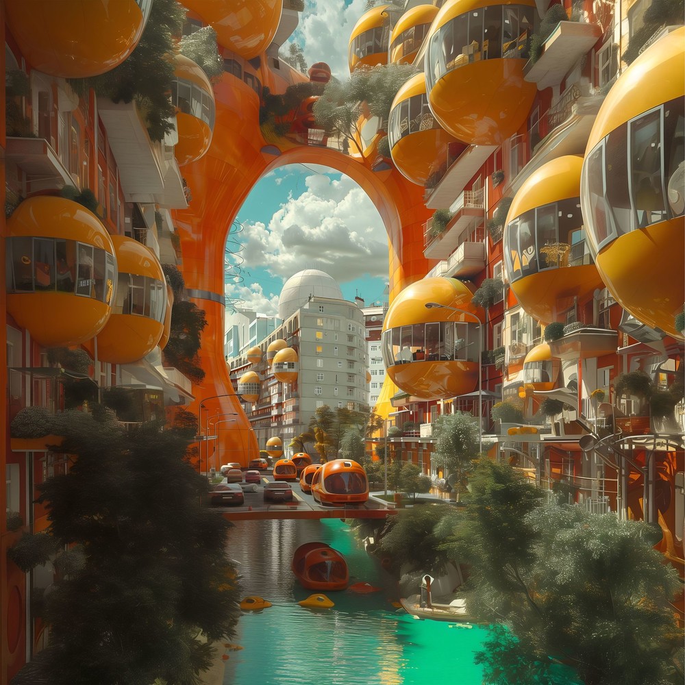 Я хотела показать город будущего, в котором приятно находиться. Тёплый, живой, человечный, а не просто умный и технологичный. В моей работе архитектура не давит, а наоборот — дарит ощущение лёгкости и свободы. Парящие оранжевые капсулы, большая арка, вода внизу, зелень вокруг — всё это детали мира, где технологии не заменяют природу, а гармонично сочетаются с ней. Главная арка соединяет две части города — для меня это символ того, что даже в футуристическом пространстве люди остаются связанными. А округлые формы капсул смягчают облик зданий, делают их уютными. Я вдохновлялась природой. Она создаёт плавные линии, которые нам интуитивно приятны. Цветовое решение строится на доминанте оранжевого - цвета энергии, солнечного света и радости. Он пронизывает архитектуру, создавая иллюзию постоянного тёплого дня. Зелёные вкрапления (растительность на балконах, в зонах общего пространства); вода и небо уравновешивают композицию, напоминая о неразрывной связи с природой. Водная гладь в нижней части кадра добавляет глубины, и работает как природный «кондиционер», охлаждая жаркий ритм города. Футуристические автомобили, вписанные в пейзаж, подчёркивают технологичность мира. Моя главная идея: будущее может быть не только высокотехнологичным, но и тёплым, цветным, вдохновляющим. Иллюзия совершенства в данном случае — это не обман, а проект желаемого, который цифровой инструмент позволяет прожить уже сегодня.