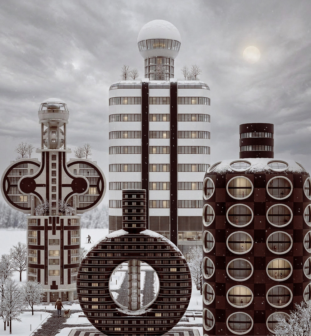 Это футуристический жилой комплекс, в котором соединились две идеи - дома в форме флаконов и стиль советского ар-деко. Вдохновением является станция метро Киевская, Москва, 1936г.