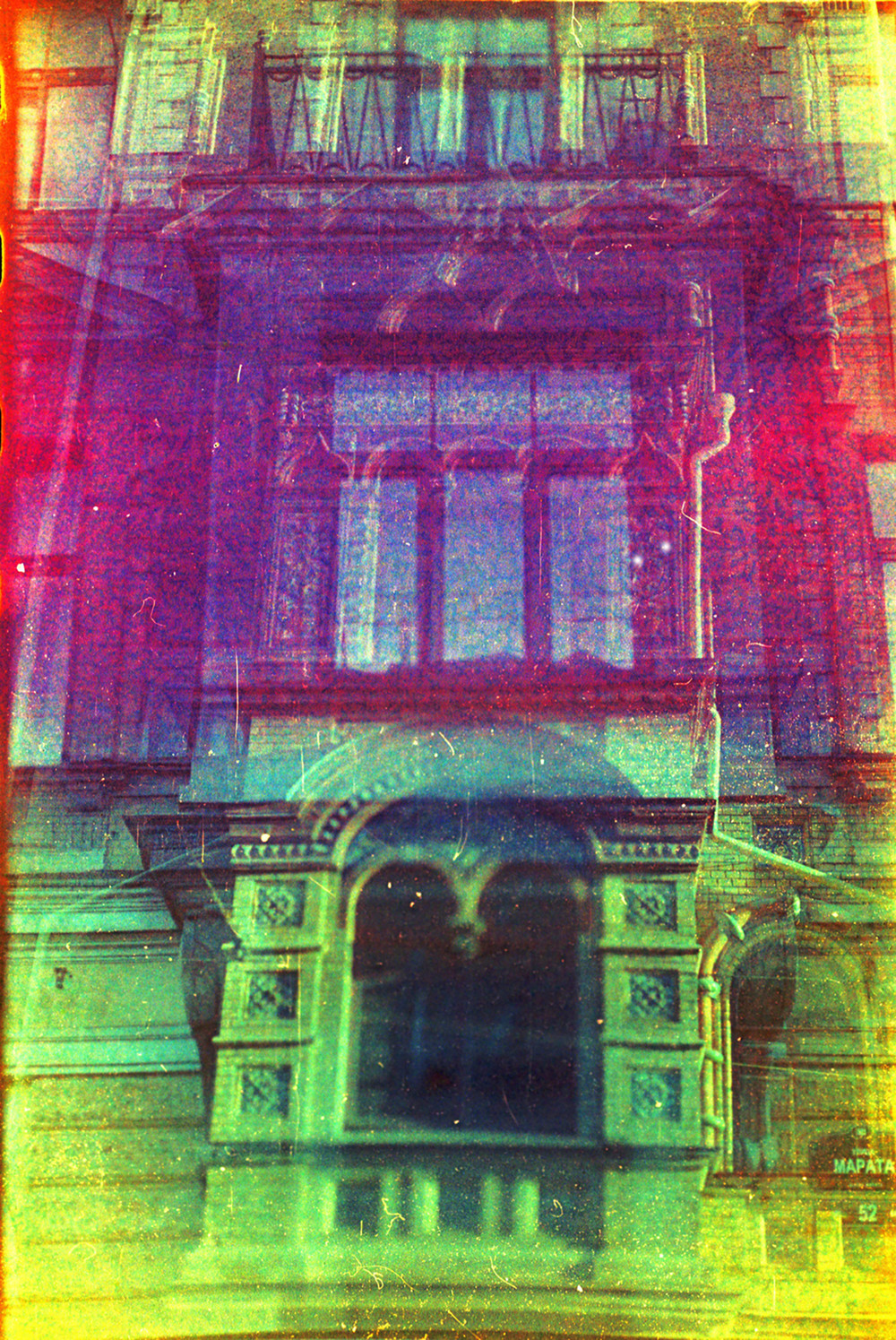 Искажения, выцветание и вспышки цвета превращают знакомую кирпичную структуру в яркую фантазийную оболочку, где реальные формы растворяются в хаосе света и зерна. Работа исследует хрупкость изображения, случайность как инструмент и рождение сказочного пространства из разрушения. Эркер здания на фотографии находится в Санкт-Петербурге на Саперном переулке 15. Здание выполнено в Русском кирпичном стиле. Кадр снят на пленочную камеру Canon A1 Объектив 50mm 1.4 Пленка Kodak gold 100 iso Проявлено вручную автором. Кадр выполнен в технике двойной экспозиции. Пленка была пожарена на сковородке перед проявкой, для получения эффекта кислотных цветов и легкого локального расфокусирования.