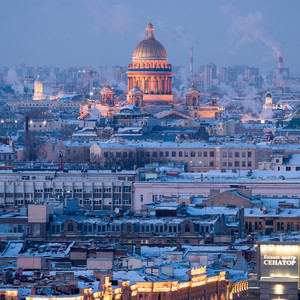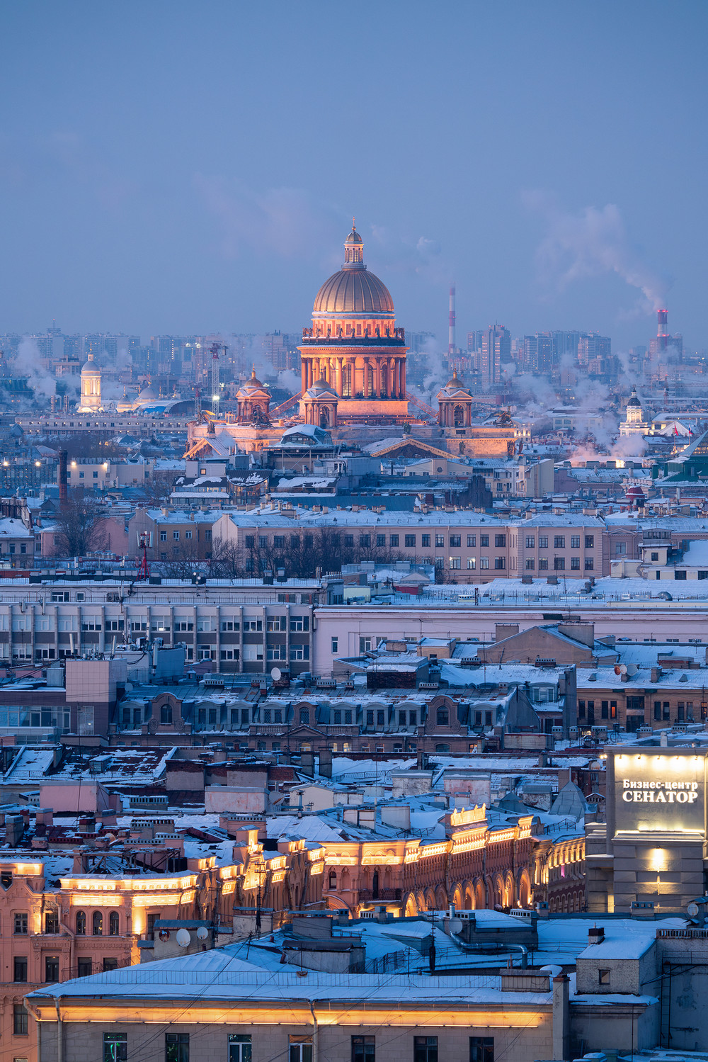 Зимний Петербург на этом снимке замер в коротком, но пронзительном мгновении «синего часа», когда дневной свет уже угас, а ночная тьма еще не успела поглотить очертания города. Воздух кажется осязаемым, густым от мороза; он окрашивает пространство в глубокие холодные и синие тона. На переднем плане раскинулось бескрайнее море петербургских крыш. Заснеженные, неровные, испещренные слуховыми окнами и частоколом антенн, они напоминают застывшие льдины, теснящиеся друг к другу в поисках тепла. Геометрия старого города здесь обнажена: ритм карнизов и дымоходов создает причудливый узор, по которому можно читать историю повседневной жизни Северной столицы. Кое-где этот холодный монохром прорезают теплые вкрапления — яркая иллюминация фасадов и неоновые вывески современности, напоминающие о том, что под этим слоем снега пульсирует жизнь мегапоилиса. Как незыблемый маяк возвышается над суетой крыш величественный Исаакиевский собор. Его золоченый купол и мощные колоннады залиты мягким, медовым светом подсветки, который вступает в драматический спор с синевой сумерек. Это сияние необычайно: собор словно аккумулирует всё тепло города, становясь его духовным и визуальным центром. Вдали, на самом горизонте, город растворяется в морозном мареве. Там, среди индустриальных силуэтов, в небо поднимаются ровные белые столбы пара — дыхание мегаполиса в крепкий мороз. Эти вертикали вторят величию соборных куполов, связывая воедино имперское прошлое и технологичное настоящее. Санкт-Петербург - город контрастов, где колючий холод зимы встречается с уютным золотом огней, а быт чердаков соседствует с вечностью золоченых куполов.