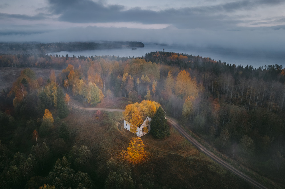 Золотой купол На фото изображено здание бывшей финской школы на хуторе Саркисюрья (Карелия). Объект представляет архитектурный интерес как образец функциональной сельской застройки середины XX века, которая в заброшенном состоянии превратилась в симбиоз рукотворной формы и дикой природы. По мнению автора, иллюзия совершенства здесь состоит в том, что проросшие через кровлю деревья не только не портят ансамбль, но и дополняют его, создавая образ, осенью напоминающий золотую шапку, или купол. Фотография фиксирует момент, когда естественный процесс разрушения создает иллюзию завершенности и композиционной целостности объекта в окружающем ландшафте. Фотография сделана при помощи квадрокоптера DJI Mavic air 2s, обработка - Adobe Photoshop, Lightroom
