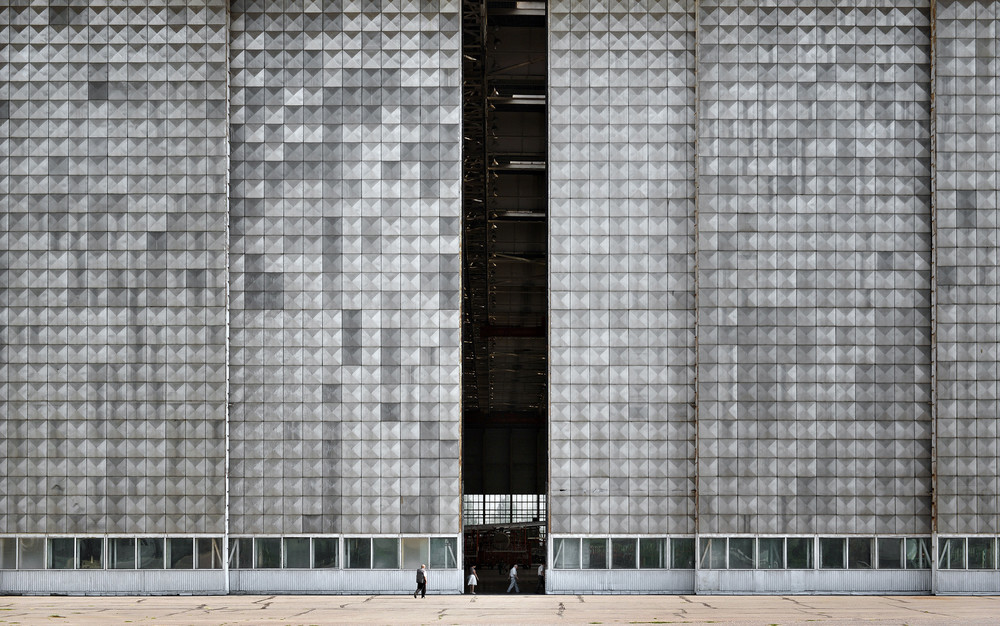 Фотография исследует взаимодействие человека и индустриального пространства. Монументальная структура здания, построенная на повторяющемся геометрическом ритме, противопоставляется хрупкому человеческому присутствию у входа.