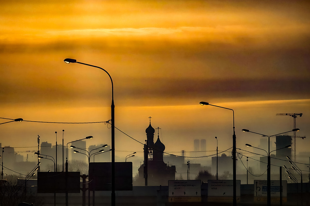 Вечерний город. Когда происходит магия, иллюзия совершенства каждого здания, каждого объекта в кадре. Когда наступит день эта магия исчезнет. И всё станет обычным, обыденным, исчезнет таинство. И даже церковь будет казаться лишней на фоне многоэтажек и уличных фонарей.